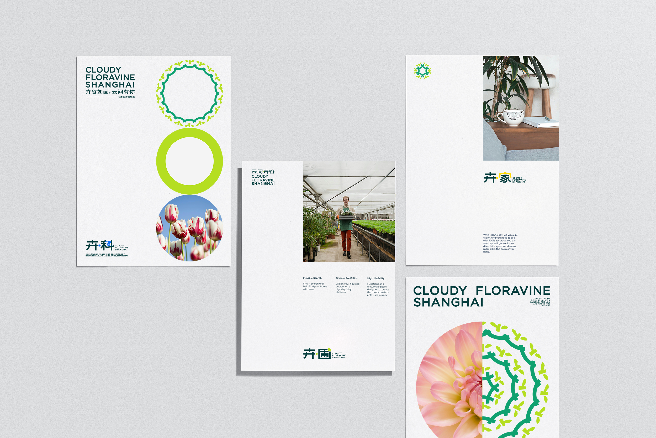 云间·卉谷是位于上海松江的绿植花卉产业园区,致力于发展成为中国花卉全产业链集聚地第一品牌。品牌方在开始系统布局品牌建设的节点,委托我们为视觉系统进行升级,以期更符合国际化与现代化的关键词。